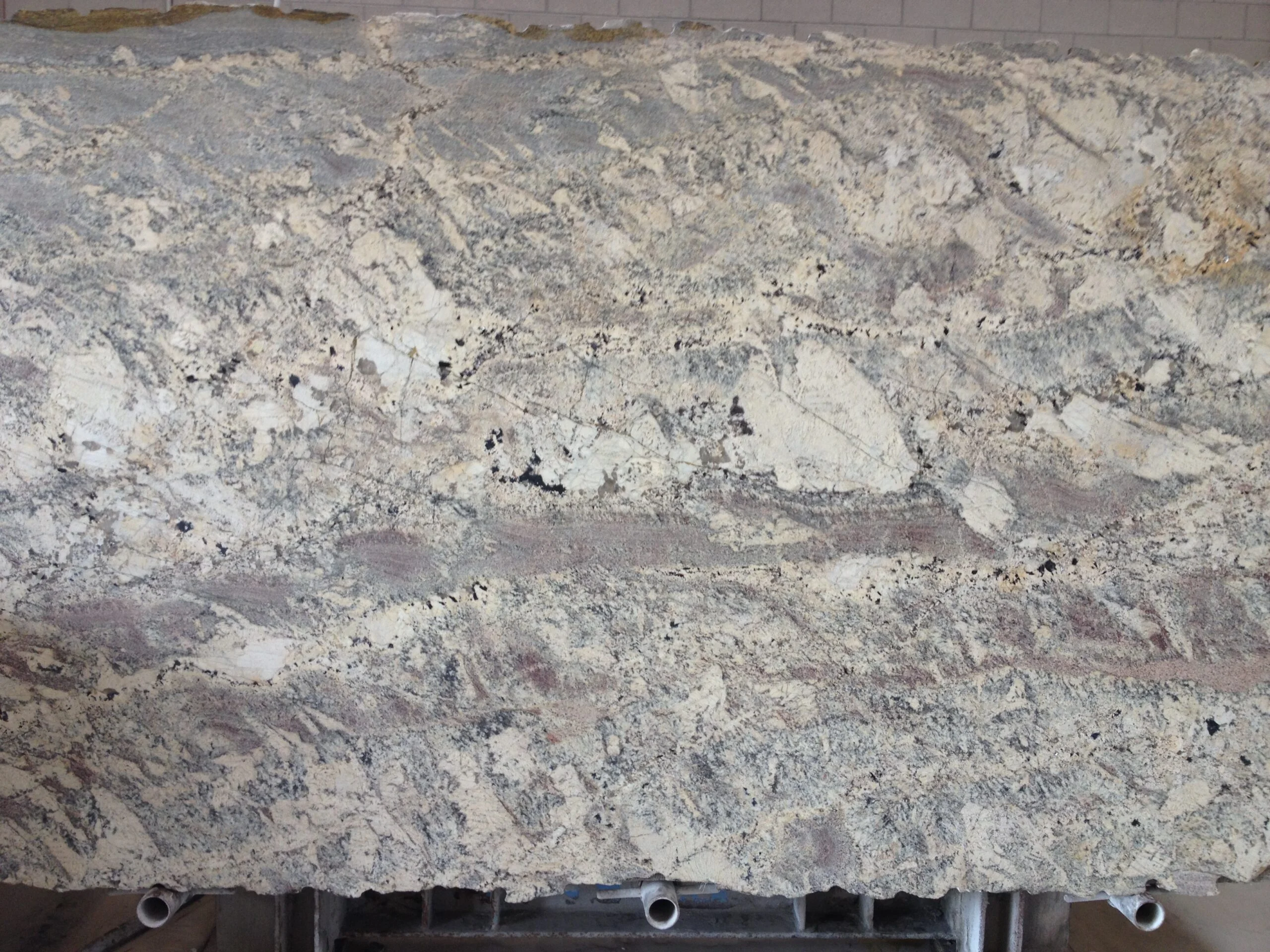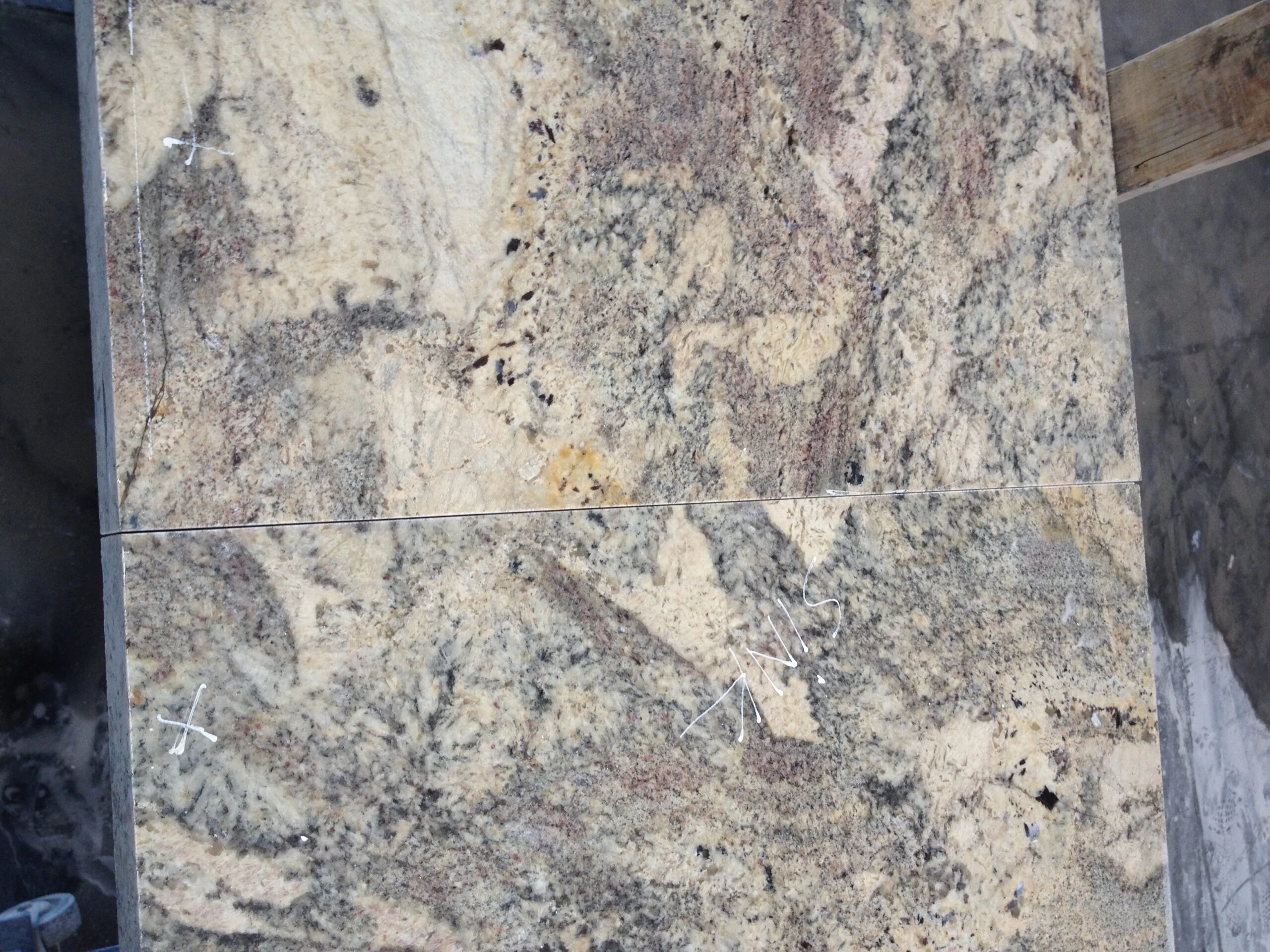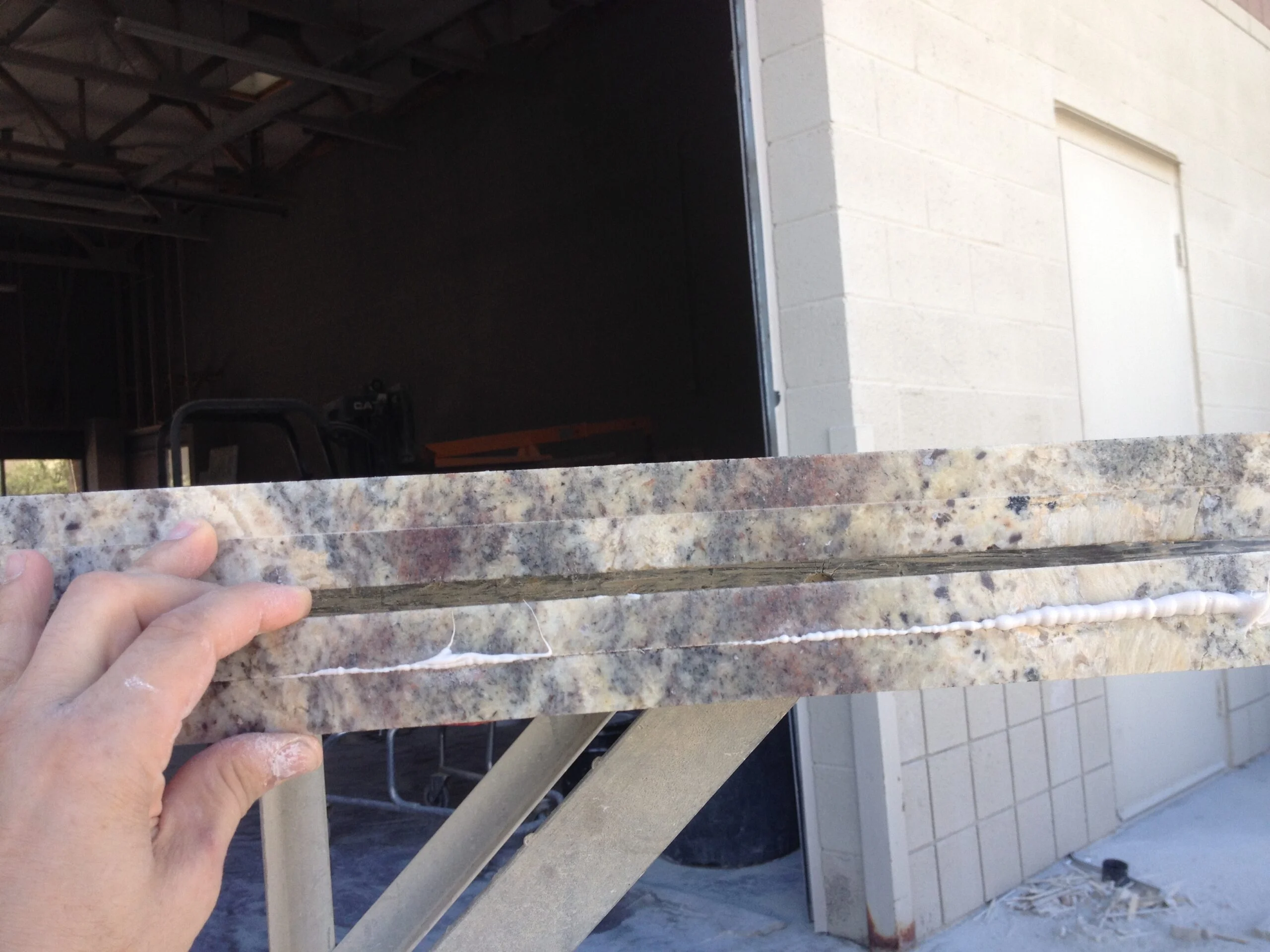 This image demonstrates the custom fabrication required for an inside corner countertop. The stone has been flipped to apply the laminated edge. You can observe the delicate nature of soft granite on the right, where a fracture occurred during the cutting phase.